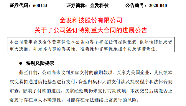 值得注意的是,金发科技公曾表示,但本次合同的交易对方美国公司,之前未与公司发生业务往来,合同相对方基于商业秘密等因素未披露其详细财务数据,也未提供国内主体履约担保措施。现全球多地处于疫情期间,公司也较难派员前往美国及可能的目的地国家或地区进行现场调查,对合同交易对方的履约能力难以做出完整、详细、准确的判断。