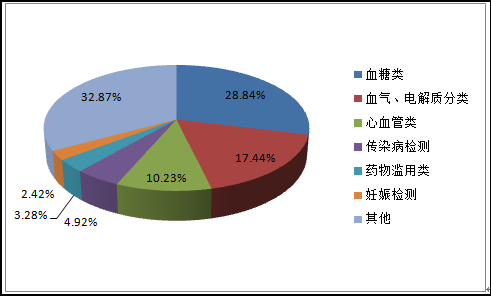 国内POCT市场主要有7部分构成:血糖类(28.84%)、血气电解质类(17.44%)、心血管类(10.23%)、传染病类(4.92%)、药物滥用类(3.28%)、妊娠检测类(2.42%)和其他检测类(32.87%)。血糖监测份额所占比重最大,但增速已经放慢,血气及电解质、心脏标志物、感染性疾病、肿瘤标志物、血脂等为主要增长点,而心脏标志物、肿瘤感染性疾病等检测处于高速成长期。