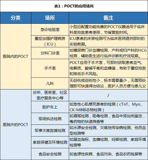 同时POCT的应用场所也在发生变化,从之前医院的检验科发展到各科室的检测使用,伴着分级诊疗在基层乡镇卫生院和社区门诊逐步被推广,相较于传统的临床检测,POCT具有即时便捷的优点,样本处理时间更短,采样现场分析更快,在灵活性与时效性方面与传统检验互补,弥补了基层医院检验资源的不足。POCT不仅出现在个人的健康医疗生活中(如常见的排卵试纸、血压计、血糖计等),还广泛应用于各行各业。2009年2月,胡锦涛主席发出了《中华人民共和国食品安全法》的主席令,相继国务院办公厅、卫生部也就加强食品安全整顿及监测工作发出了通知,要求加强食品安全隐患应急检验,对导致食品安全事故的食品及其原料应立即检验。食品检测的高标准与严把控成为执法人员的首要责任,也成为POCT市场开发的新渠道。灾难救援疫情控制场所对POCT产品提出了更高的要求:小巧轻便外形坚固,操作便捷精准,检验报告可以远程发送等,这些不同行业的应用环境给POCT发展开辟了新的思路。(具体见表1)