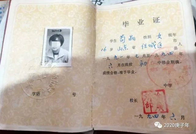 苟晶在济宁任城区的初中毕业证。受访者供图