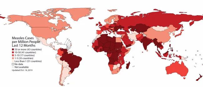 欧洲情况也不好,一直就未得到很好的控制。2018年欧洲的麻疹病例更是比2017年翻了三倍。麻疹的传染性非常强,病死率也不低。根据维基百科,麻疹患者的病死率为0.2%,但是在营养不良的孩童中高达10%;还有很多患儿在出现脑膜炎、肺炎等症状后遗留下后遗症。根据现有的最新数据,全球在2018年估计有140,000多人死于麻疹。